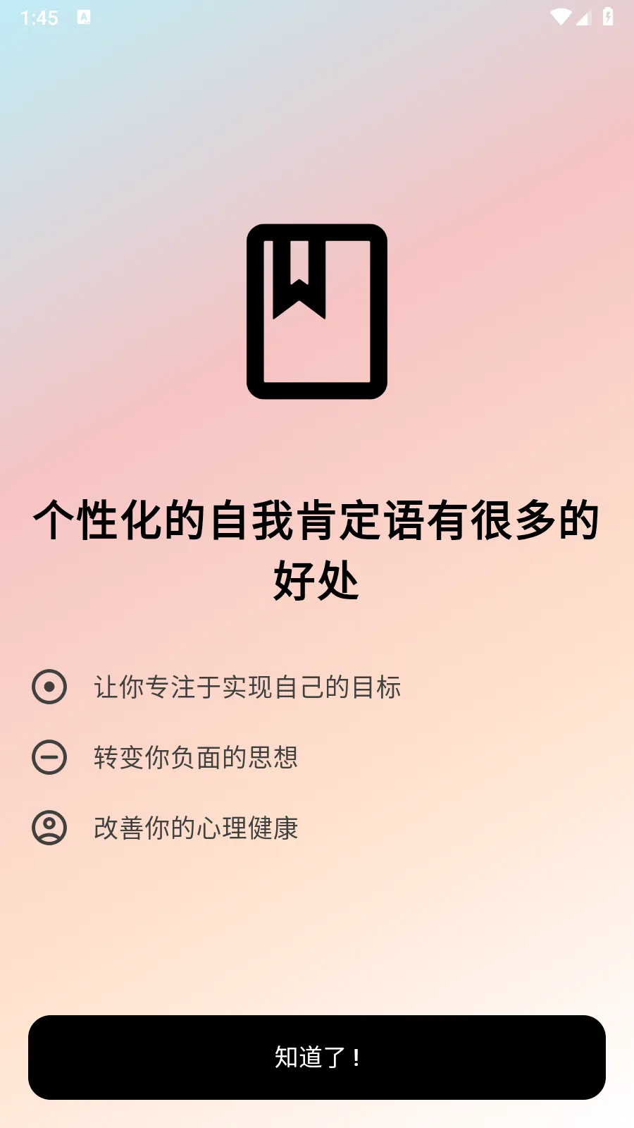 我很好2025官方最新版本是一款专注正念的每日短句推送软件。提供心理赋能、个性小组件等功能,有深度个性化定制等特色,含大量积极正面语句,助用户转变负面思想,实现自我成长与心理改善。