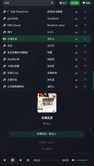 使用便捷:无需注册账户即可直接开启核心功能,操作简单,界面简洁,还支持智能搜索,输入歌名、歌词、歌手甚至模糊拼音,都能毫秒级响应找到目标音乐。