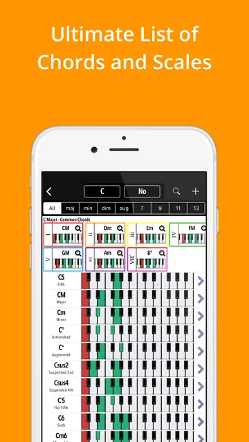1. 灵活辞典与反向模式:Piano Companion LITE提供灵活的和弦音阶辞典,配备用户库和反向模式,一切尽在掌控。