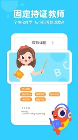 伴鱼少儿英语为孩子提供了优质的英语学习体验。它聘请国际认证的欧美外教和中国教师,免费体验伴鱼课堂。软件打破传统语言学习方式,真人外教语音视频通话应用有趣。在学习过程中通过PK和角色扮演,学习气氛积极活跃。精心设计的课程体系,融合科学的少儿教学理念,强化孩子的语言敏感度。严选来自英美澳加等国外教,均持有教学资格证且接受专业培训。界面设计风格简单有吸引力,课程一对一辅导教学,老师热情服务个性化。还精心设计了丰富的课程互动环节,引导孩子与外教实时互动,强化口语能力。能让孩子在纯正地道的英语环境下学习成长,掌握地道英语口语,是一款不错的儿童英语学习软件。