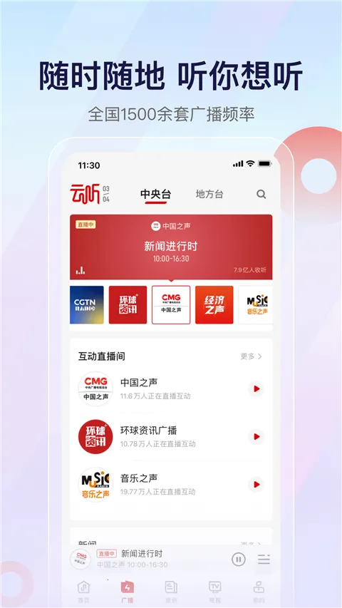 中央人民广播电台云听app是重点打造的广播音频软件,资源丰富,涵盖英语、健康、娱乐等多类型节目,能5G畅听,满足多样需求,睡前听书入眠,还能随时用它打发时间、发现精彩、学习知识。