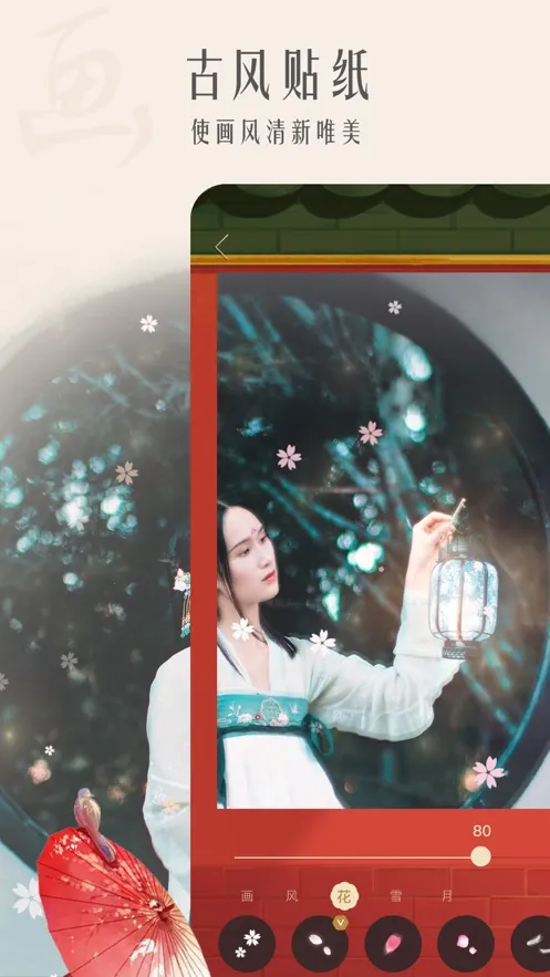 具备丰富古风元素,结合风花雪月等自然景物作为贴纸,还有古代元素的印章画框,好看又实用,持续添加新元素,让照片更添诗情画意。