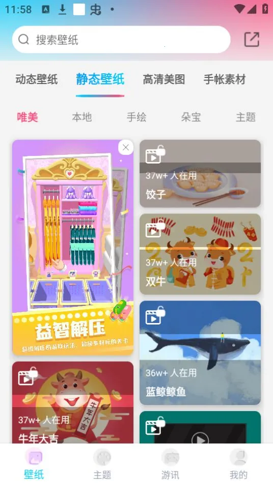 智能分类标签查找便捷,一目了然的智能分类标签,快速搜索功能让你轻松找到心仪壁纸,节省查找时间,满足你的个性化需求。