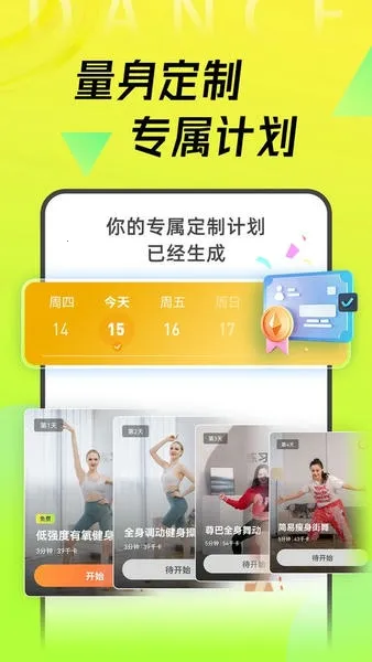 个性化锻炼计划:根据用户当前身体状况、减肥目标及想改进的领域,量身定制舞蹈锻炼计划,4周内可按常规进行并感受舞蹈乐趣。