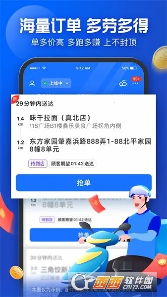 1. 海量订单,收入丰厚:依托饿了么平台海量订单,多劳多得不封顶,报酬随工作量增长,上不封顶,让骑手有更多赚钱机会。