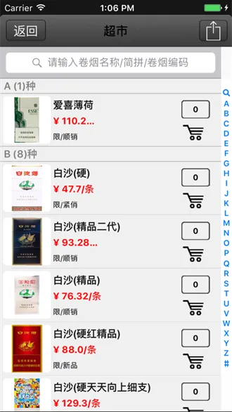 操作便捷:支持多种上网方式,利用手机客户端操作,实现卷烟订购、信息查询等功能,还能通过条码扫描快速订烟,简单加入购物车。