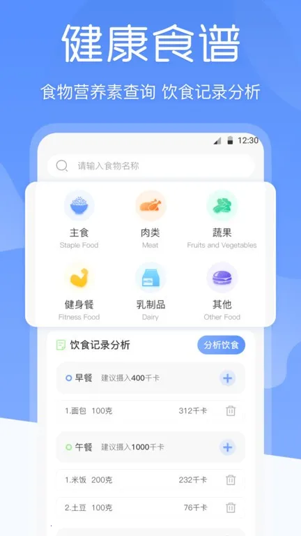 2. 热量分析:拥有海量食物数据库,能随时查询热量及营养成分,还可对每天饮食进行热量分析,为减重人群提供参考,助您吃得更健康。