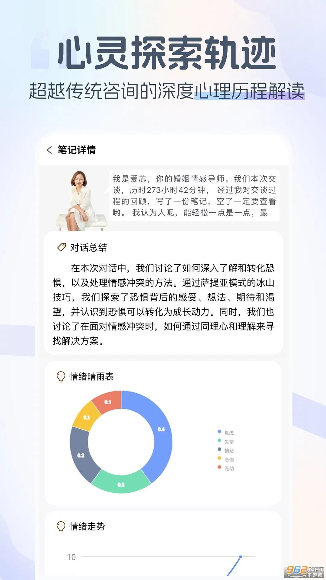 平台提供多种特色服务。用户能通过AI心理咨询一键咨询心理健康问题,选择专业咨询师解答疑惑,更好地疏导心理。支持心灵探索,记录心灵轨迹并分析笔记详情,了解情绪走势。心理测评可评估生成专属报告,还有专业成长系统助用户在线练习成长。