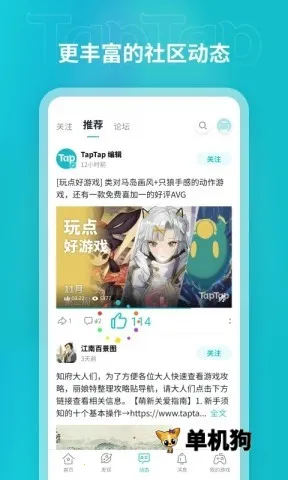 嘿,想知道taptap海外版叫什么?其实它就叫TapTap,是一款超棒的高品质游戏社区平台哦!在这儿找心仪游戏特简单。它可不是普通的手游推荐平台,而是个有千万玩家的热闹社区。专业测评团队从全球挑游戏推荐,特设搜索栏能按你口味找游戏。首页全新设计,评价推荐方式优化,能快速找到游戏和真实评价。社区动态丰富,能和其他玩家互动,知道大家在玩啥。靠社区驱动,能发现好多新游戏。游戏专页综合了简介、评分、评价和论坛互动,一键就能直达官方下载或更新游戏,省了不少繁琐操作。不管是想找新游戏,还是和玩家交流分享,TapTap都能满足你,赶紧免费下载,开启精彩游戏之旅吧!