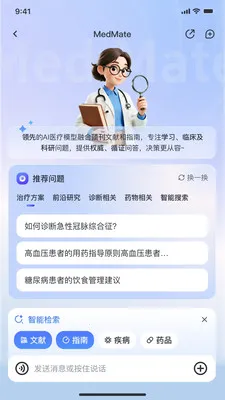 MedMate(医学辅助工具)可解决临床与科研问题,能搜文献、指南、疾病、药品等。基于指南文献并结合患者病例生成诊疗方案,新版特性为订阅升级。