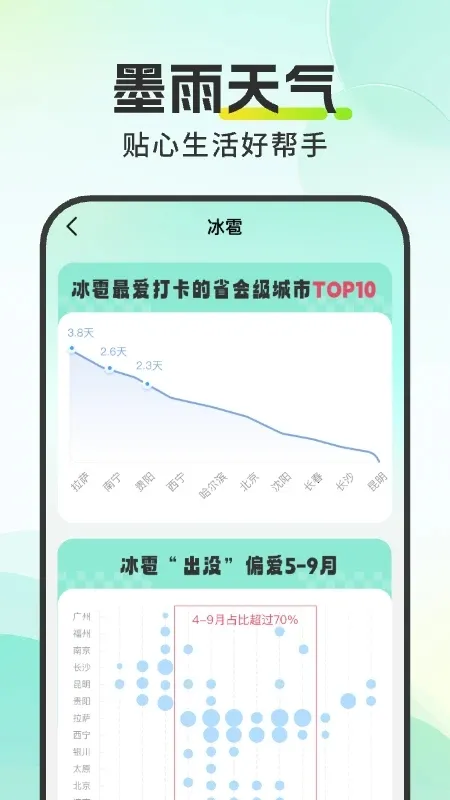 墨雨天气是一款天气预报应用,能实时监测天气,提供未来几天详细预报,展示温度、湿度等。可添加城市精准定位,有图解天气、多城市查询等功能,数据实时更新,还有预警通知,保护隐私,方便实用。