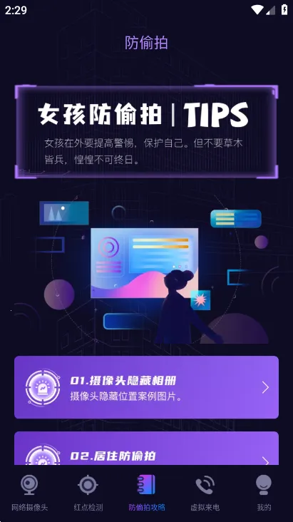 摄像头探测器手机版是实用的摄像头检测工具,能探测周围隐蔽摄像头,防偷拍和隐私泄露。支持模拟来电,操作便捷,利用数据挖掘技术深度扫描,一键检测,智能匹配,可精准定位可疑设备,保护隐私安全。