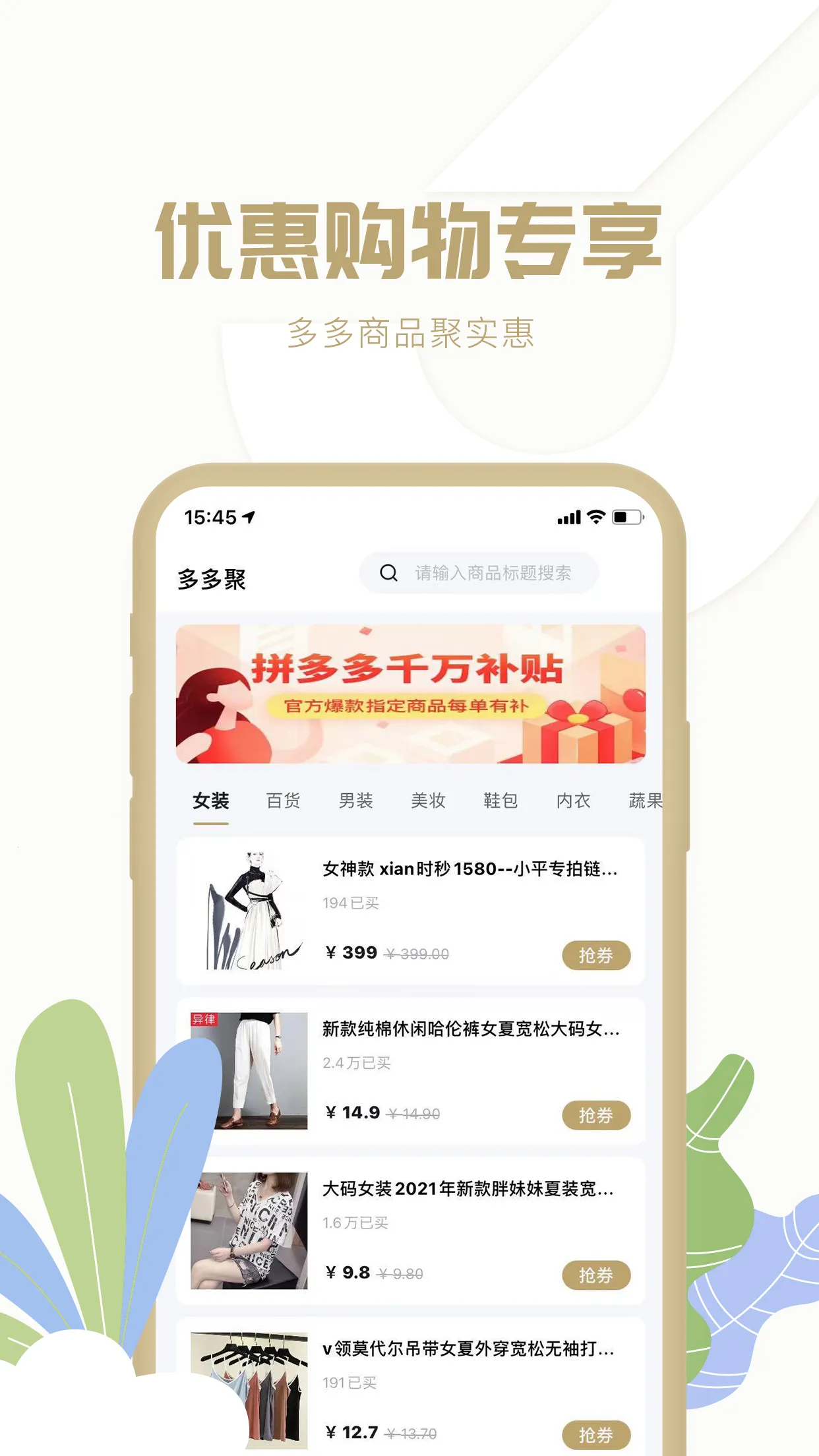 多多聚是一款优惠购物平台,为用户提供海量商品资源,带来多重选择,提供便捷网上购物服务。无需会员就能享受vip特权,拥有高品质购物体验。所有商品均可优惠购买,不定期发送优惠券和抵用券,物美价廉经济实惠。在这里,用户不仅能购买东西,还能和好友随时聊天。软件汇集各大网络平台热门畅销的精选商品,大家也可将购买的商品分享给好友。快来多多聚,享受优惠购物的乐趣!