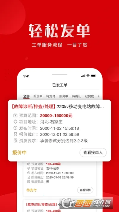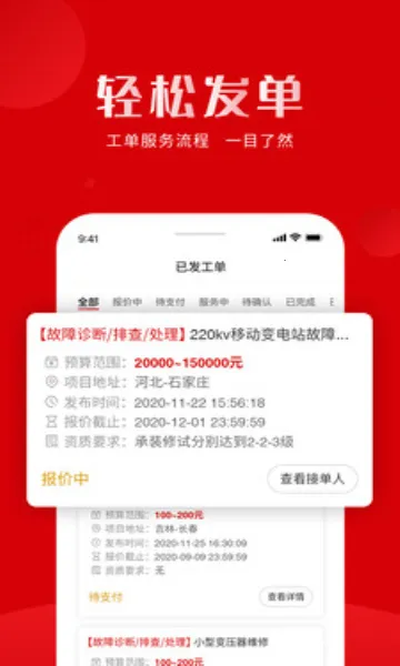 这里有丰富多样的工单资源,覆盖诸多类型,能一站式满足用户的接单服务需求。工单详情详细,项目地址、时间和要求等信息一目了然,便于高效对接服务。而且所有工单真实可靠,保障了用户收益无忧。其发单流程强大且智能,可智能匹配,便于高效对接。还能在线报价、实时关注工单状态、自动记录接单数据、在线提现、进行发票管理等。有需求的用户快来下载体验,享受这便捷高效的服务平台,开启轻松接单赚钱之旅。