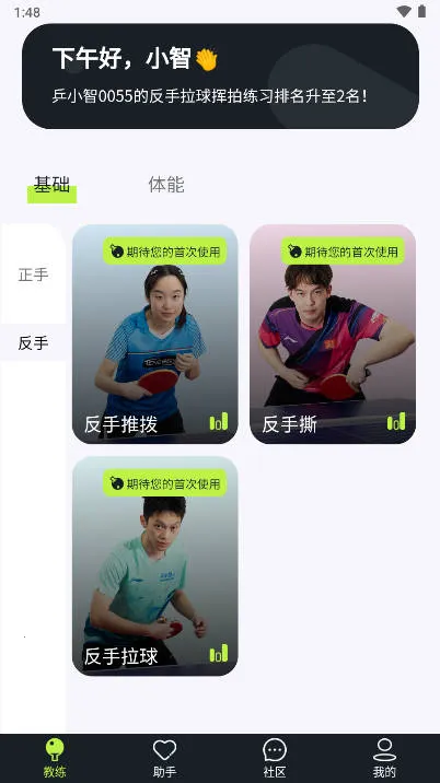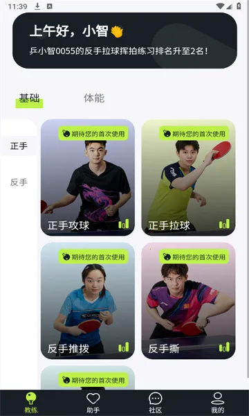 如果你热爱乒乓球,那乒小智App绝对值得拥有!它功能超强大,能解决不少乒乓球训练难题。海量的乒乓球训练教程,帮你掌握正确动作要点,哪怕是新手小白也能快速提升水平。通过手机摄像头捕捉挥拍动作,与顶级运动员标准比对,实时指出偏差并给纠正建议。还能查看训练数据,了解自己训练情况。社区交流板块可与其他爱好者分享经验。多种训练模式满足个性化需求,比如挥拍动作规范、步法敏捷练习、得分技巧传授等。不管是家庭训练利用碎片时间,还是俱乐部教学让教练针对性指导,亦或是赛前备战模拟对手打法,它都能轻松应对。操作也简单,进入软件在教练页面学运动,助手页面剪辑视频,社区页面互动交流。别犹豫啦,赶紧来试试,让乒小智助力你成为乒乓球高手!
