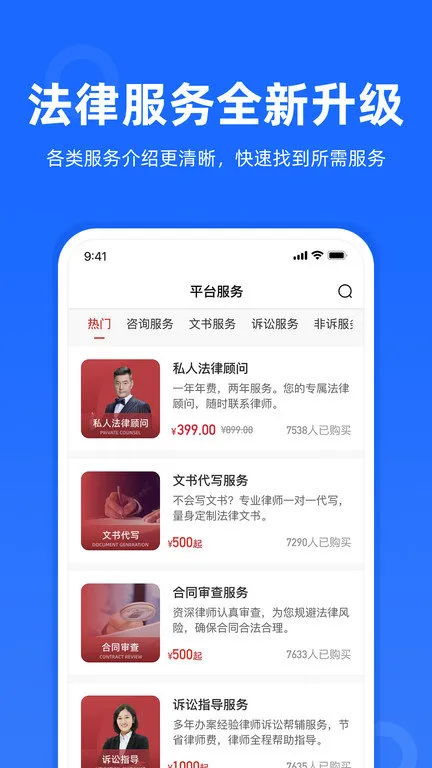 3. 提供多种服务方式,如在线找律师、问律师、电话呼叫律师、合同审核等,涵盖各类常见法律问题。