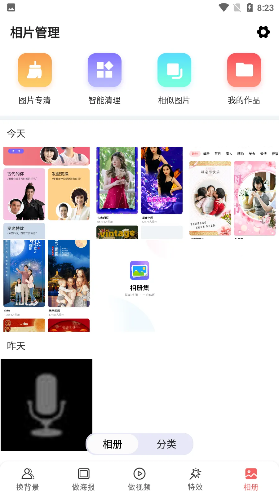 相册集是一款超棒的多功能手机相册软件。它能帮你轻松管理手机相册,智能分类查看超方便。不管是编辑图片还是制作专属相册模板,它都能满足你。有强大的图片编辑功能,能添加超多特效和贴纸,一键美图美颜相机,美颜自拍滤镜特效随手就来。还能一键自动抠图,合成换背景,有数百种背景模板可选。提供海量视频模板,能把照片轻松制作成视频,还有丰富的视频模板滤镜和背景音乐,省去找素材的麻烦。海量精美海报模板,节日祝福、家人随拍、美食艺术等应有尽有。能智能清理相册,删除不需要的照片。软件小巧轻快,无付费和广告。总之,相册集能给你全新的图片编辑体验和手机相册管理方式,赶紧下载开启创作之旅吧!