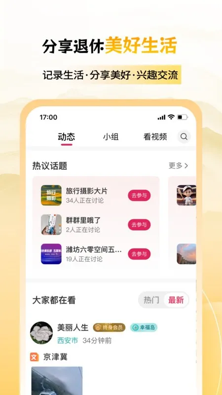 3、旅游分享:用户可以上传旅途照片和游记,分享旅途的美好与感悟。与其他退休人员交流旅游心得,丰富退休生活。