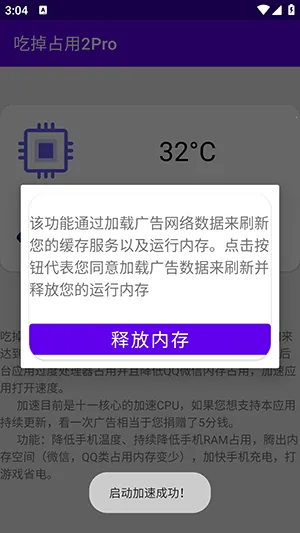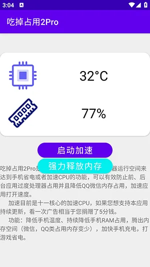 吃掉占用2ProApp是一款安卓内存清理与优化工具。它能精准清理无用文件和垃圾,释放空间提升速度。采用多核线程技术,清理算法精准,避免误删。新加入CPU加速功能,优化设置降温度和功耗。支持一键回收内存泄漏的App,解决卡顿。手机运行慢、空间不足、玩游戏等场景都适用。使用教程简单,下载安装后点击加速CPU按钮即可。软件清理效果显著,操作简便,安全可靠,受到广大用户喜爱好评。