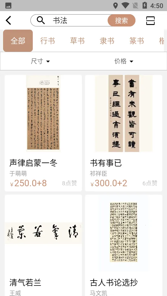 海量作品,种类丰富:软件收录了丰富的艺术作品,涵盖国画、油画、书法等多种类型,画作丰富且内容齐全,包括山水画、花鸟画和人物画等,还有各种艺术商品在线出售,商品多样,除文房四宝外,还有专属的各类文美商品和护肤商品,满足不同需求。