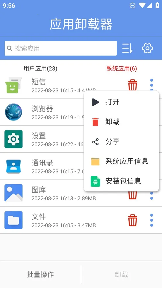 它支持单独卸载和批量卸载,一键就能迅速卸载不需要的软件,帮你释放存储空间,优化手机性能。按应用类别区分用户应用和系统应用,让应用类型一目了然,方便管理。还能提供清晰的全应用数据展示,支持按应用名称、包名、大小、安装时间和升级时间等五个维度排序。内置APK安装包详情解析,避免你误删。有一键卸载、自动清理和充电保护等功能,实用性超强,能一键清理手机垃圾。操作也简单,下载安装后打开,自动识别应用,点击删除图标就能卸载,想批量卸载就点击左下角批量操作。有了它,卸载应用超轻松!