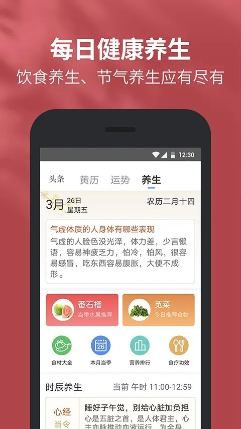 黄历功能也丰富,有详细老黄历信息,每日宜忌、吉生肖、吉日选择都能查到,还有生日提醒、节日安排和传统养生建议。万年历能实时更新节假日纪念日信息。
