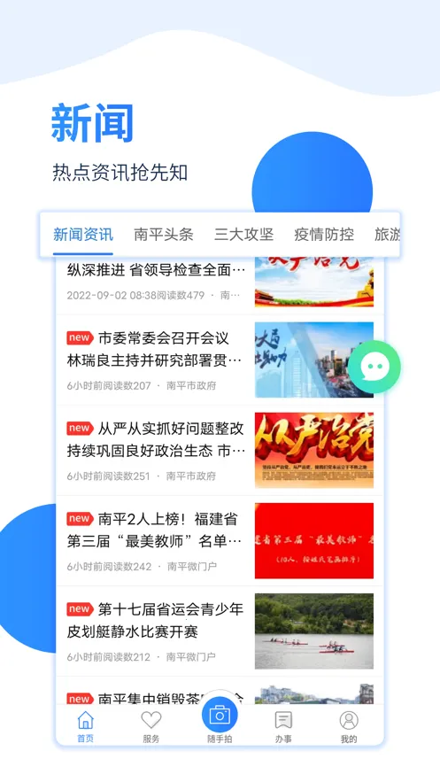 掌上南平app由福建南威软件有限公司研发,整合资讯、政务、生活等服务。有随手拍、实名认证等特色功能,提供公交查询等便民服务,经多次更新优化性能,让南平市民办事更便捷。