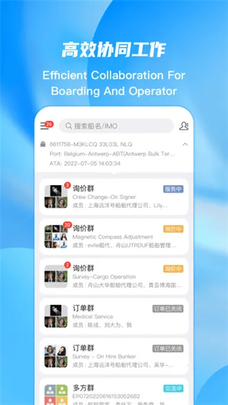 该软件为船舶经营方、船舶代理、船长、供应商等多角色提供一站式船舶在港智能海事解决方案,已覆盖全球近80%的在港船舶综合服务。通过航运信息化数据协同共享等方式,满足不同角色的一键注册、即时通讯以及船舶在港全进程监控等特色功能支持。用户可跨角色创建聊天群组,借助智能船舶定位及追踪服务,不断提升企业的服务品质及执行效率。代理人能随时了解客户任务分配,接收服务各环节进展预警,即时沟通并创建跨角色协作沟通群组,快速了解客户任务变化。客户可随时发布船舶进港任务及港内服务要求,建立多角色业务组,加速与座席智能化沟通。整体来看,它能极大提升船舶运输管理效率,满足不同角色在船舶运输服务中的多样需求,是一款相当实用的软件。