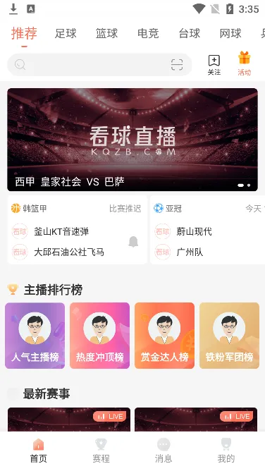 这是一款深受体育爱好者喜爱的软件。它能让你随时随地观看全球各大体育赛事直播,足球、篮球、网球等赛事应有尽有,且直播信号高清流畅。软件界面简洁,赛程预告清晰,不会让你错过任何精彩对决。在这里,有专业人士解说比赛,帮你更懂球赛门道。就算错过直播也无妨,随时能回看完整比赛。比赛数据实时更新,让你第一时间掌握赛况,还能把直播投到电视上,大屏看球超爽。它按关注、重要、全部分类查询赛事,还有我的关注、每场赛事评论、观看历史、我的收藏等特色功能。赛事热点、数据、集锦、直播等亮点满满。它为球迷打造专属社区,能找到想看的赛事自由在线观看,还可实时查看比分。总之,是一款非常不错的体育直播软件。