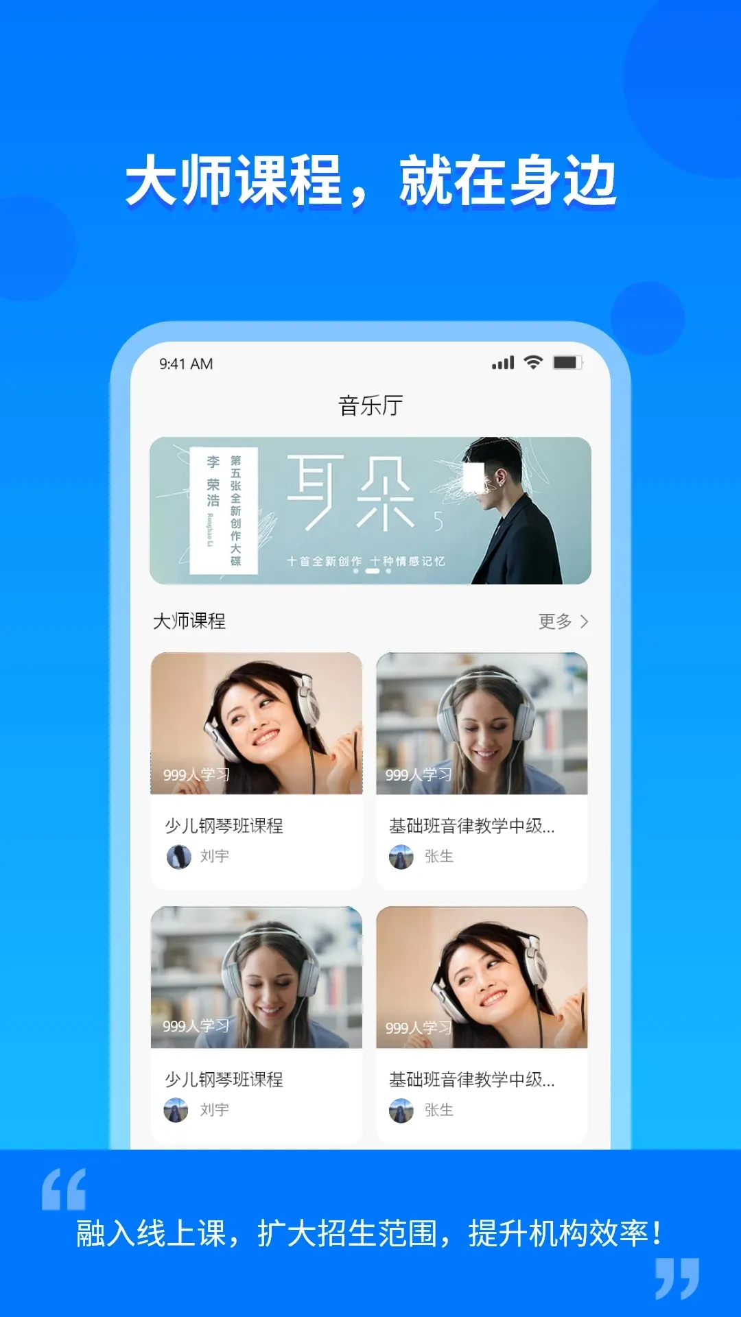 云上E教是一款专注于音乐教学的应用工具,专为专业音乐院校、中小学、音乐高考机构、文化馆等提供物联网智慧音乐教学交流服务方案。它精选名师课程,提供专业指导,让学生能够在线学习音乐知识,并轻松分享个人作品。通过直播在线教学、视频课程、知识点解析、错题本、在线作业、问答社区等功能,云上E教为用户带来了更贴心的音乐教学体验。此外,它还拥有丰富的曲目和考试题库,能够满足用户的各种学习需求。如果你对音乐教学感兴趣,不妨下载云上E教,开启你的音乐学习之旅。**云上E教为音乐学习提供了全方位的支持,无论是专业音乐院校的学生还是音乐爱好者,都能从中受益。**它打破了传统教学的束缚,让音乐教学更加高效、简单,让你在学习音乐的过程中享受更多乐趣。
