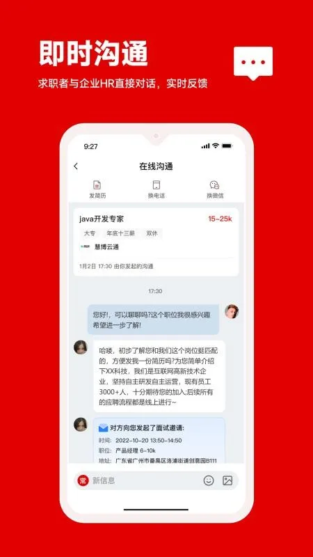 3. 高效对接:能让求职与招聘双方随时在线快速对接需求,企业HR可高效招聘优质人才,求职者也能轻松找到合适工作,节省双方时间。