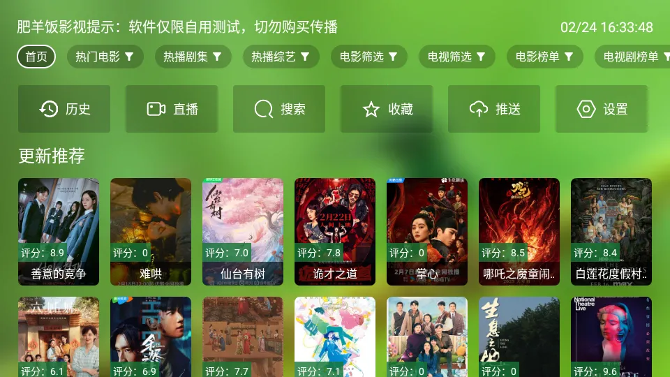 肥羊饭影视是一款影视播放软件,可在智能电视安装。自带众多播放源,同步新影视,无广告免费大屏追剧。影片多路线,支持4K播放。还能看直播,有丰富影视资源,界面简洁,操作便捷,支持离线缓存。