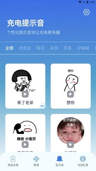充电提示音电池管家是一款实用的手机充电管理工具,能智能识别充电状态,显示电量等信息,有智能省电、完整充放电识别电池容量功能,还可换充电提示音,加速充电,守护电池健康。