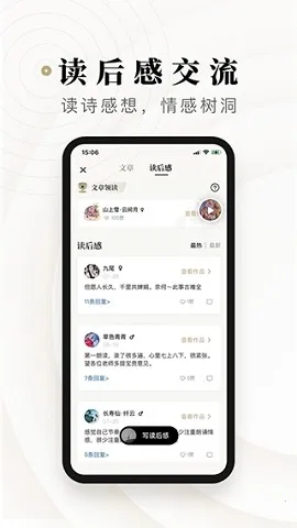 2. 强大的创作与交流功能。支持诗词创作,你的作品会被广泛传诵,还能收获他人读后感。同时,每篇诗词都有大量同好交流感想,仿佛置身线上读书会,大家以诗相交,分享见解心得。