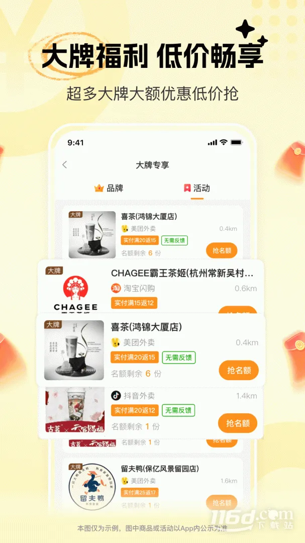 2. 优惠超丰富:每天都有大额外卖红包可领,海量福利如下午茶、奶茶、水果等优惠活动不断,让你在外卖点餐时尽享更多实惠。