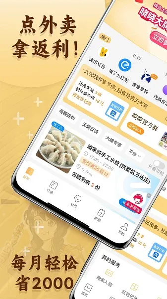 1. 返利轻松拿:点外卖能拿返利,每月轻松省钱且无门槛,享受大牌福利,单单极速秒审核,无需提现直接秒到账。