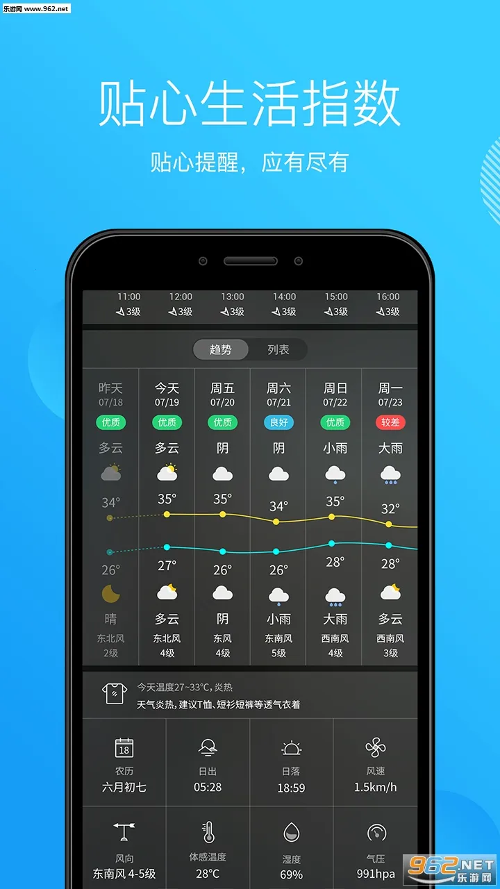 4、贴心生活服务:提供8大生活指数,全方位服务生活。每日同步更新央视天气预报视频,还有天气语音播报功能。