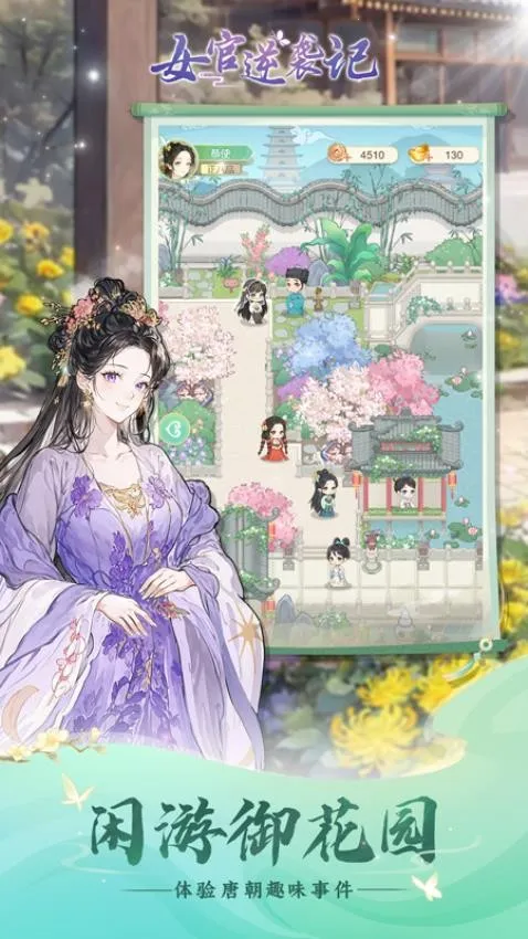2. 古风经营玩法:采用国风画风展现唐朝宫廷风貌,玩家经营司织房,发展经济,招揽宫女,扩大势力,重振司织房昔日佳名。