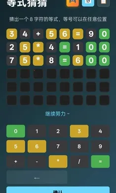 一款超烧脑的数字游戏来袭。每一关都设有专属神秘等式,你只有6次猜想机会。每次输入推测等式后,游戏会给出精准反馈提示,助你判断数字、运算符号及排列顺序是否正确。你要依据反馈逐步推理,排除错误答案,在次数用尽前锁定唯一正确等式。这极其考验你的数字敏感度与逻辑推理能力。想象一下,面对一道道神秘等式,你需凭借智慧和推理去揭开谜底。每一次猜测,每一次根据反馈调整思路,都是对自己能力的挑战。在这个过程中,你会不断挖掘自身潜力,感受数字与逻辑交织的魅力,体验成功猜出等式的成就感,快来试试吧。