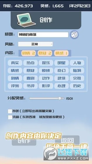 3、持续更新与成长:不断改进小说获得更多粉丝,和粉丝自由交谈。游戏持续更新,如v1.0.7版本增加更多随机事件、道具回收站,房屋容量增加,房价上涨,更多买房可获得写作能力,宠物收集时间缩短,灵感上限变为99999等。