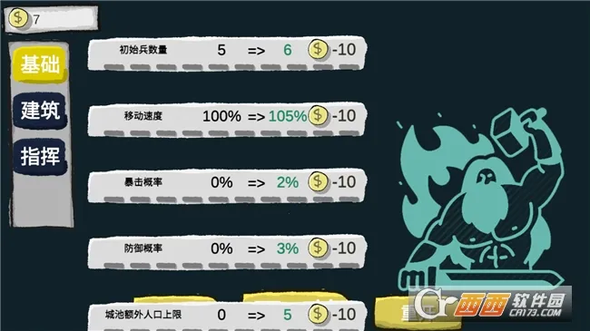 在兵种与建筑功能方面,城池是基础且重要建筑,能征召普通士兵和屯兵;粮仓可加快征兵速度;兵器库加暴击;训练场加移速;铁匠铺加防御。