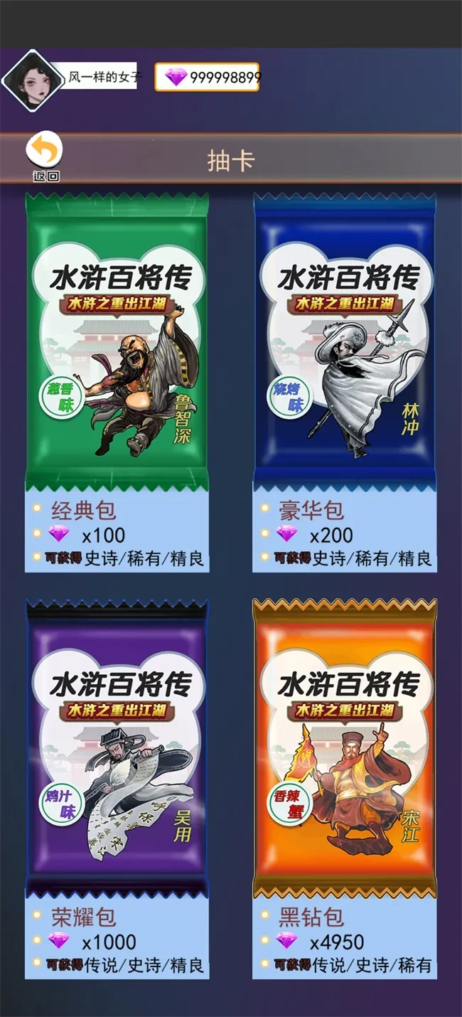 2. 英雄众多,各具特色:囊括梁山一百单八将等传奇人物,每位英雄都有独特技能与背景故事。
