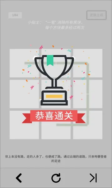 一笔消2025官方最新版本,是一款将一笔画与消除机制完美融合的益智手游。游戏画面清新简约,操作简单易上手,玩家需用一笔划过所有黑色方块将其消除。关卡丰富多样,难度循序渐进,前期简单,后期极具挑战性,能充分考验玩家的逻辑思维与空间规划能力。当经过方块时,其颜色会黑白变换,增加了路径规划的难度。此外,游戏还设有提示功能,助玩家在遇困难时找到正确路径,带来全新且有趣的游戏体验。