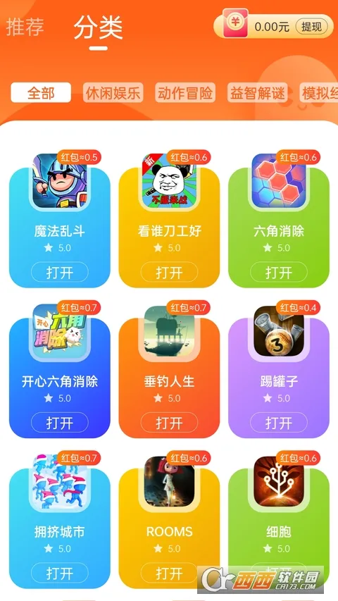 4. 分类清晰好找游戏:全部休闲娱乐、动作冒险、益智解谜、模拟经营等分区一目了然,还能根据标签与评分快速筛选。