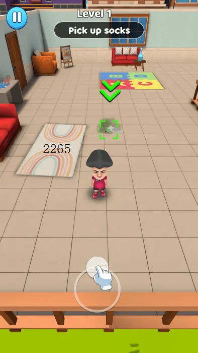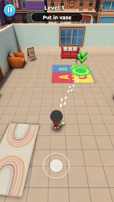 1、进入游戏关卡后首先需观察场景布局,明确恶作剧的最终目标人物与可互动的环境物品,例如散落的臭袜子或待插花的花瓶,通过滑动屏幕控制角色移动至这些道具旁边。