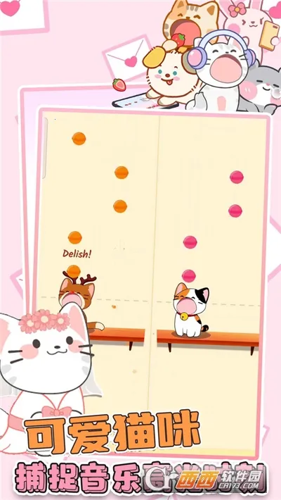 2. 有多种游戏模式,如互动关卡,拖动屏幕调整白猫位置触碰道具推进任务;节奏模式,观察下落音符准确点击,同时兼顾猫咪移动与道具收集。