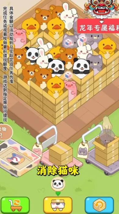 想通过玩游戏赚钱吗?猫咪请就位就能满足你!这是一款超有趣的休闲赚钱游戏。它有着可爱的猫咪角色和丰富的关卡设计,玩法简单易懂,只要把三个相同的猫咪消除打包成盒就能过关。消除越多,红包越多哦!