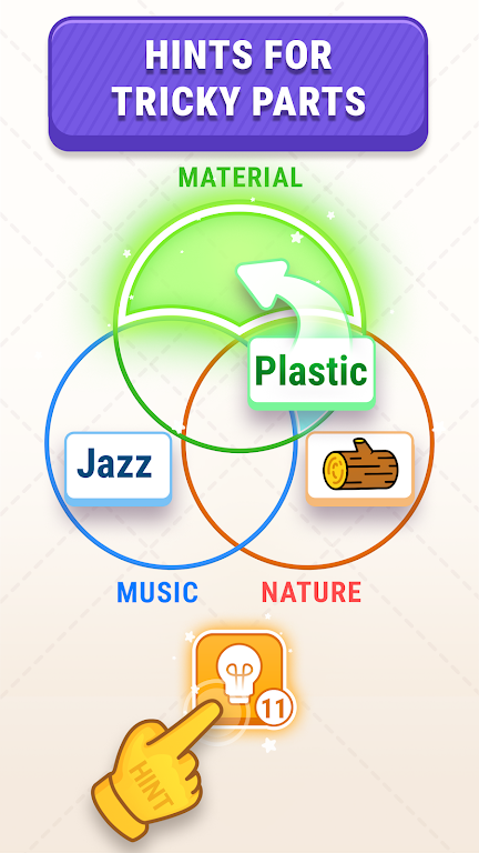 3. 多样化谜题设计:谜题富有挑战性,简单明了又出人意料,有多个环重叠区域和意想不到的类别组合,考验创新思维与反应能力,适合不同状态的玩家。