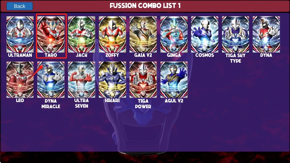 2、在组合列表中,选择心仪的奥特曼角色,例如“TARO”,点击确认。