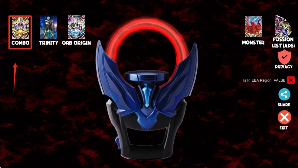 1、进入模拟器主界面,点击COMBO卡牌,准备进行奥特曼变身操作。